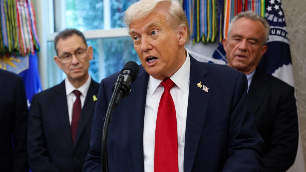 U.S. President Donald Trump announces a deal with Pfizer to lower Medicaid drug prices in the Oval Office of the White House on Sept. 30, 2025 in Washington, DC.